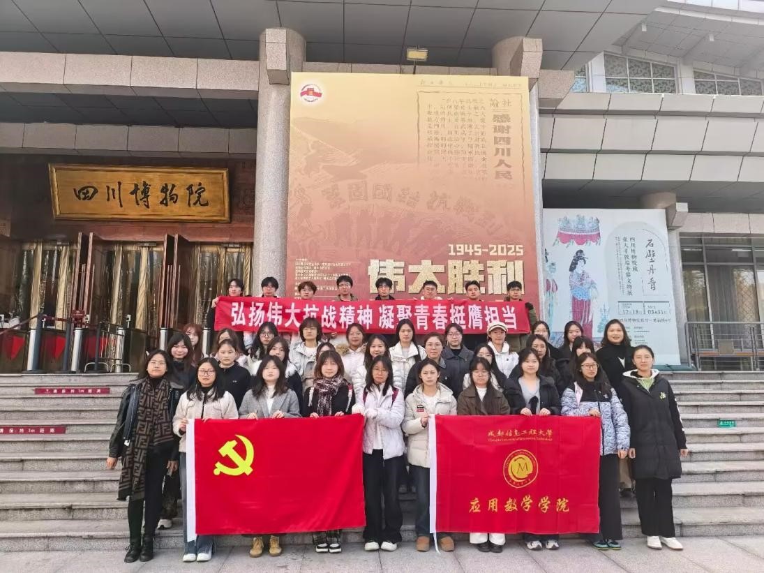 为深入贯彻习近平总书记在纪念中国人民抗日战争暨世界反法西斯战争胜利80周年大会上的重要讲话精神,牢记历史,缅怀英烈,弘扬伟大抗战精神,12月4日下午,应用数学学院党委组织学生党员赴四川博物院开展主题为“弘扬伟大抗战精神 凝聚青春挺膺担当”的主题党日活动:近40名学生党员、入党积极分子在学生党支部书记曾凤娇、唐智慧老师带领下参观“伟大胜利 川渝贡献——纪念中国人民抗日战争暨世界反法西斯战争胜利80周年主题展”。