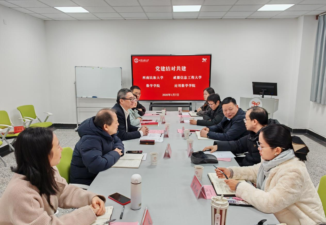 为深入学习贯彻党的二十届四中全会精神,进一步推动学院党建工作提质增效,深化党建业务双融双促,1月7日上午,应用数学学院党委书记林细俤、院长周钰谦、党委副书记朱正华等一行前往西南民族大学数学学院开展专题学习调研暨党建结对共建签约,受到了西南民族大学数学学院党委书记王军、院长谭颖、党委副书记华莎、副院长刘晓光、李庆等的热情接待。