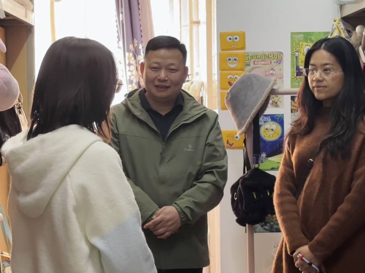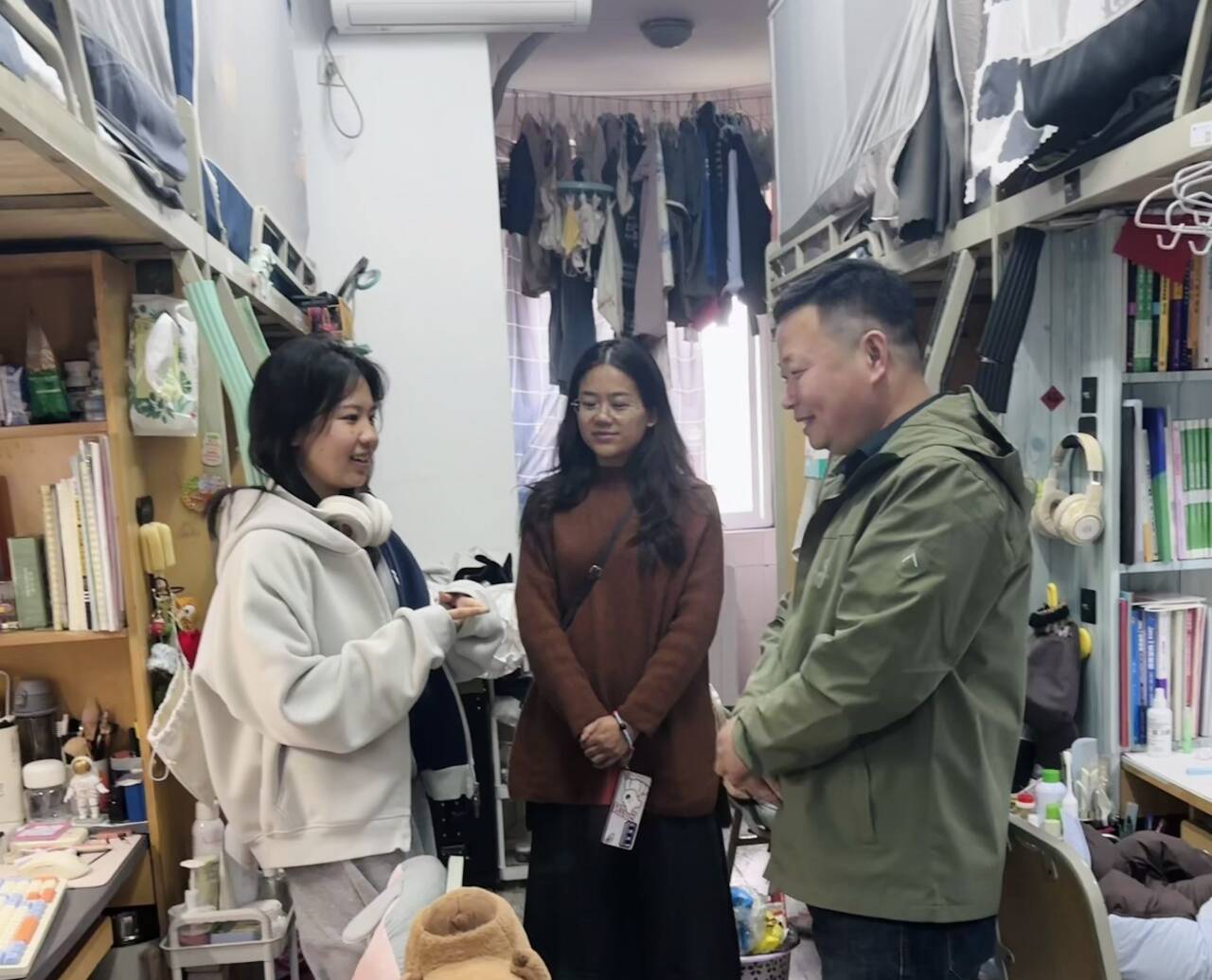 当天下午,林细俤和辅导员曾凤娇、张秋敏走进学生宿舍,开展寝室走访活动。此次走访以卫生检查为切入点,旨在深入了解学生的生活状态。林细俤对整洁有序的宿舍给予了充分肯定,同时针对部分寝室存在的用电安全、垃圾清理及床铺整理等问题提出了具体的改进意见,引导学生从日常点滴做起,培养健康生活习惯,共同营造安全、整洁、文明的居住环境。