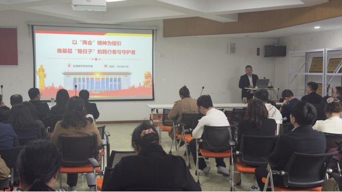 会议伊始,林细俤带领全体教职工开展政治理论学习。他首先以《以“两会”精神为指引,做基层“稳日子”的践行者与守护者》为题,专题传达学习2026年全国两会精神。他回顾了2025年国家经济社会发展取得的主要成就和“十四五”时期我国经济社会发展取得的历史成就,发生的历史变革,并重点围绕李强总理所作的《政府工作报告》中“一体推进教育科技人才发展”“加强基础学科与交叉学科建设”等重要部署进行系统解读;结合当前国内外政治经济形势和2026年政府工作十大任务,引导教职工精准把握政策信号和社会发展趋势,坚持稳中求进工作总基调,践行担当、凝聚合力,将两会精神学习贯彻融入学院高质量发展全过程。